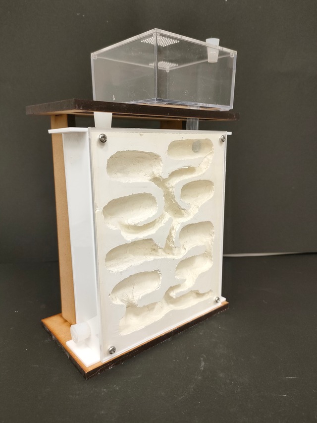 <初めてのアリ飼育に最適> <女王アリと働きアリ数十匹のコロニーを飼育するための簡単キットです。> <初心者の方や、自由研究などにもオススメします。> 【商品の特徴】 ①中型種~クロオオアリ等の大型種も飼育可能です。 ②石膏巣上部には給水用の穴(10mm)が空いています。付属のスポイトを使って給水してください。乾燥が苦手なアリもいます。冬場は注意しましょう。 ③エサはエサ場ケースに入れてあげましょう。 ④連結用チューブは好きな長さに切って使用してください。 【商品サイズ】 ・石膏飼育ケース 148mm×118mm×38mm ・エサ場ケース 79mm×79mm×40mm 【材質】 石膏、アクリル板、mdf、プラスチック 【付属セット】 ・石膏飼育ケース、エサ場ケース、連結用チューブ(5cm×径10mm)、シリコンゴム栓、スポイト 【商品の状態】 ・ハンドメイド品ですので、多少のキズや 凹凸あります。了解してお買い上げお願いします。(プチプチで梱包発送します) 【ご注意】 ・石膏巣は必ず給水(最初は50ml~100ml)してからご使用ください ・月に1~2回は必ず給水をしてください