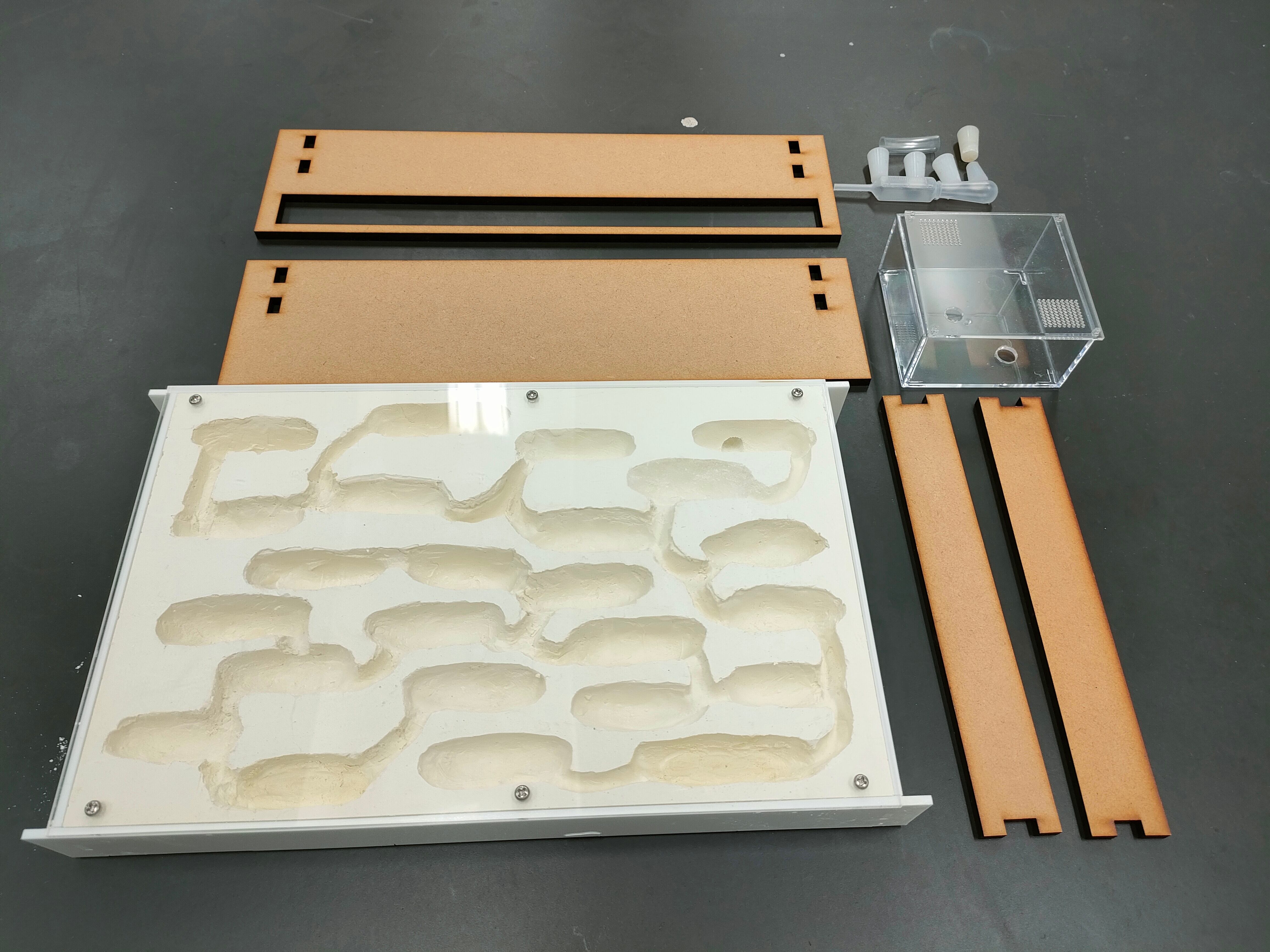 ・石膏飼育ケース、エサ場ケース、連結用チューブ(5cm×外径10mm)、シリコンゴム栓、スポイト