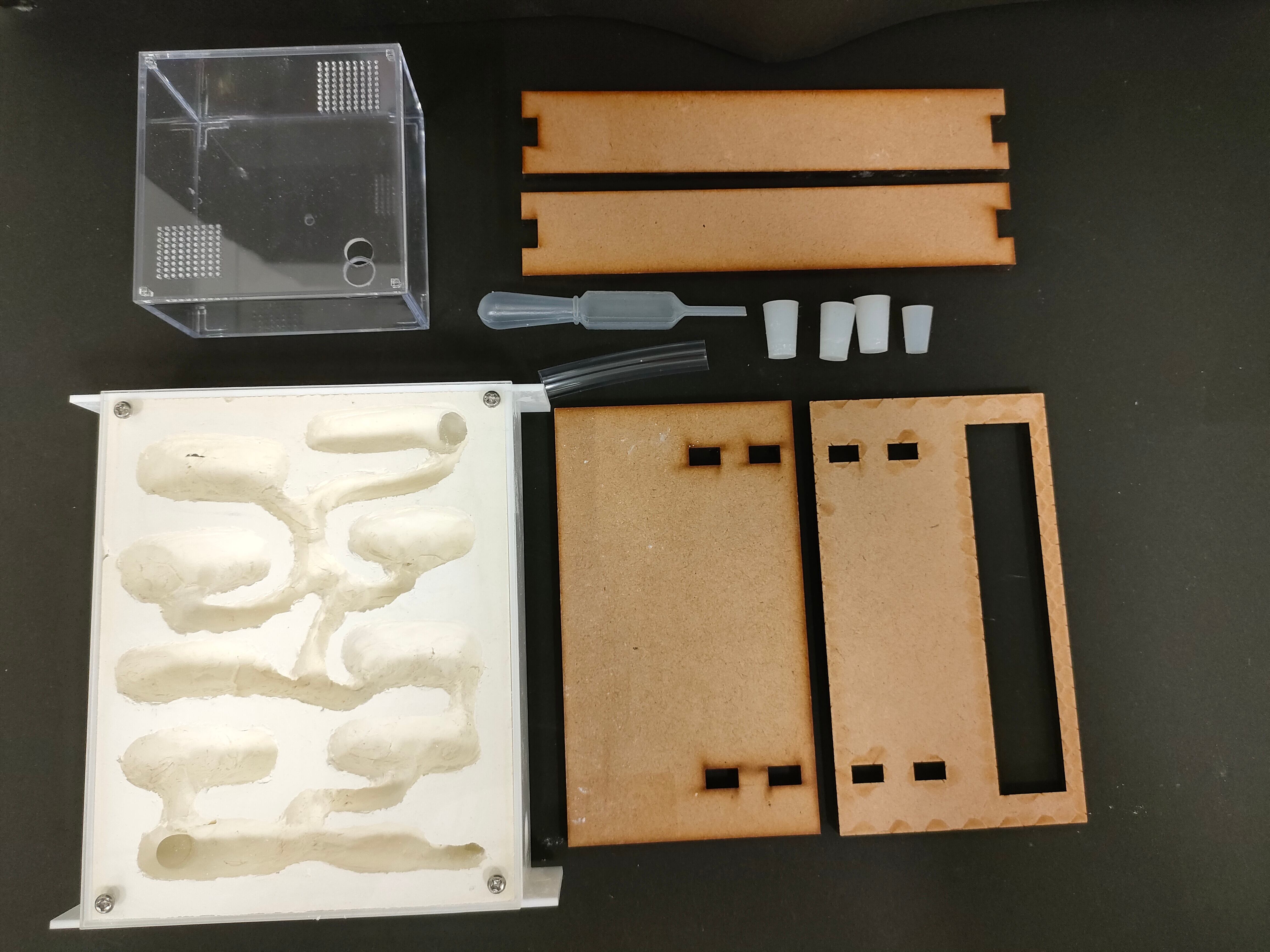 ・石膏飼育ケース、エサ場ケース、連結用チューブ(5cm×径10mm)、シリコンゴム栓、スポイト